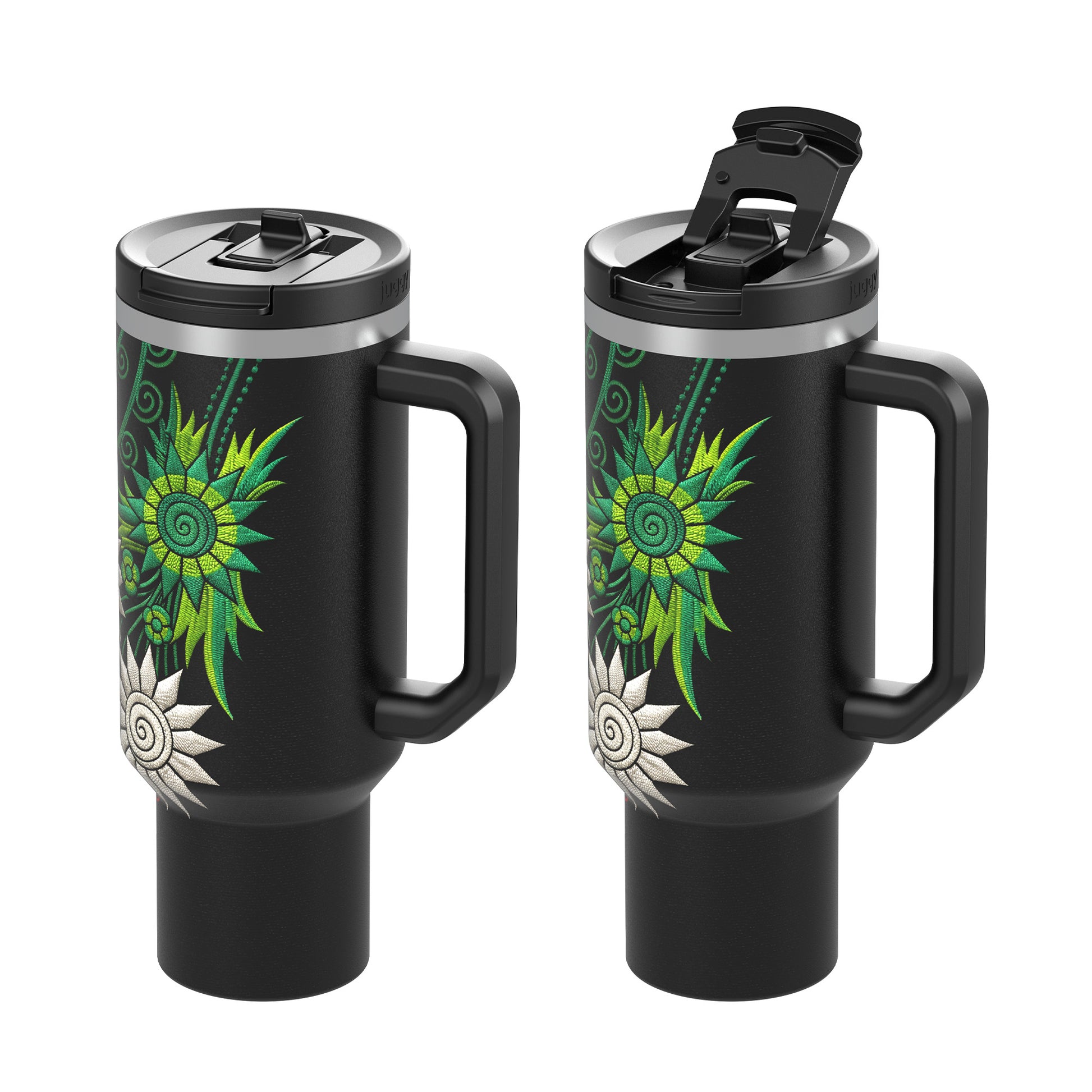 The Viva México 40oz Tumbler features an elegant, embroidered-inspired floral design in the colors of the Mexican flag, set on a sleek matte black finish. Designed for women who want to represent their culture with style and confidence.