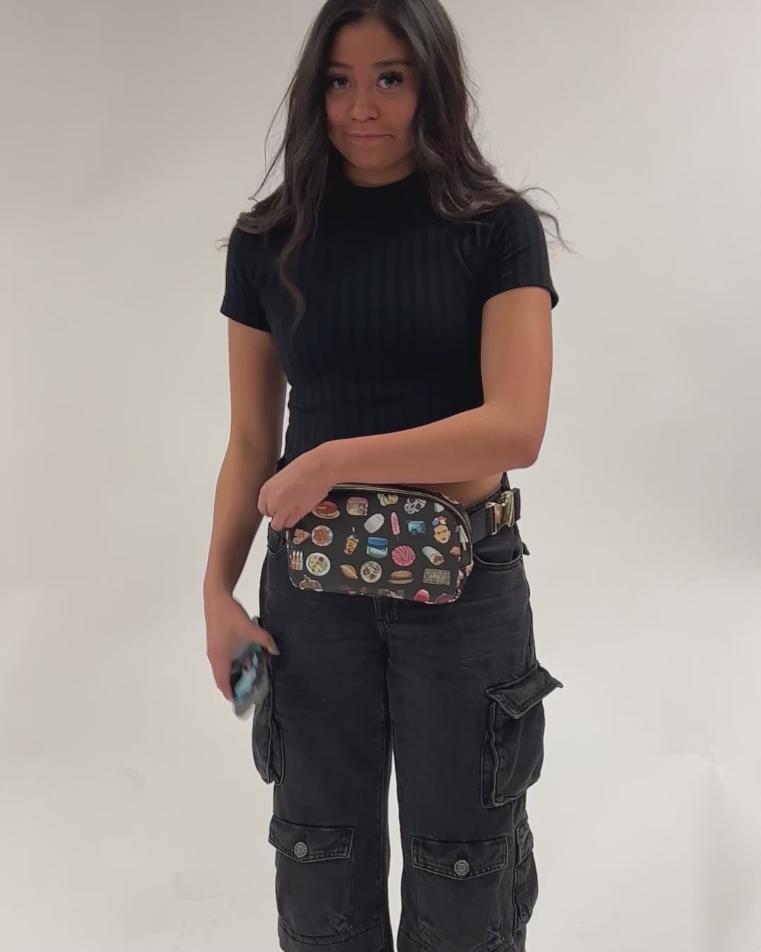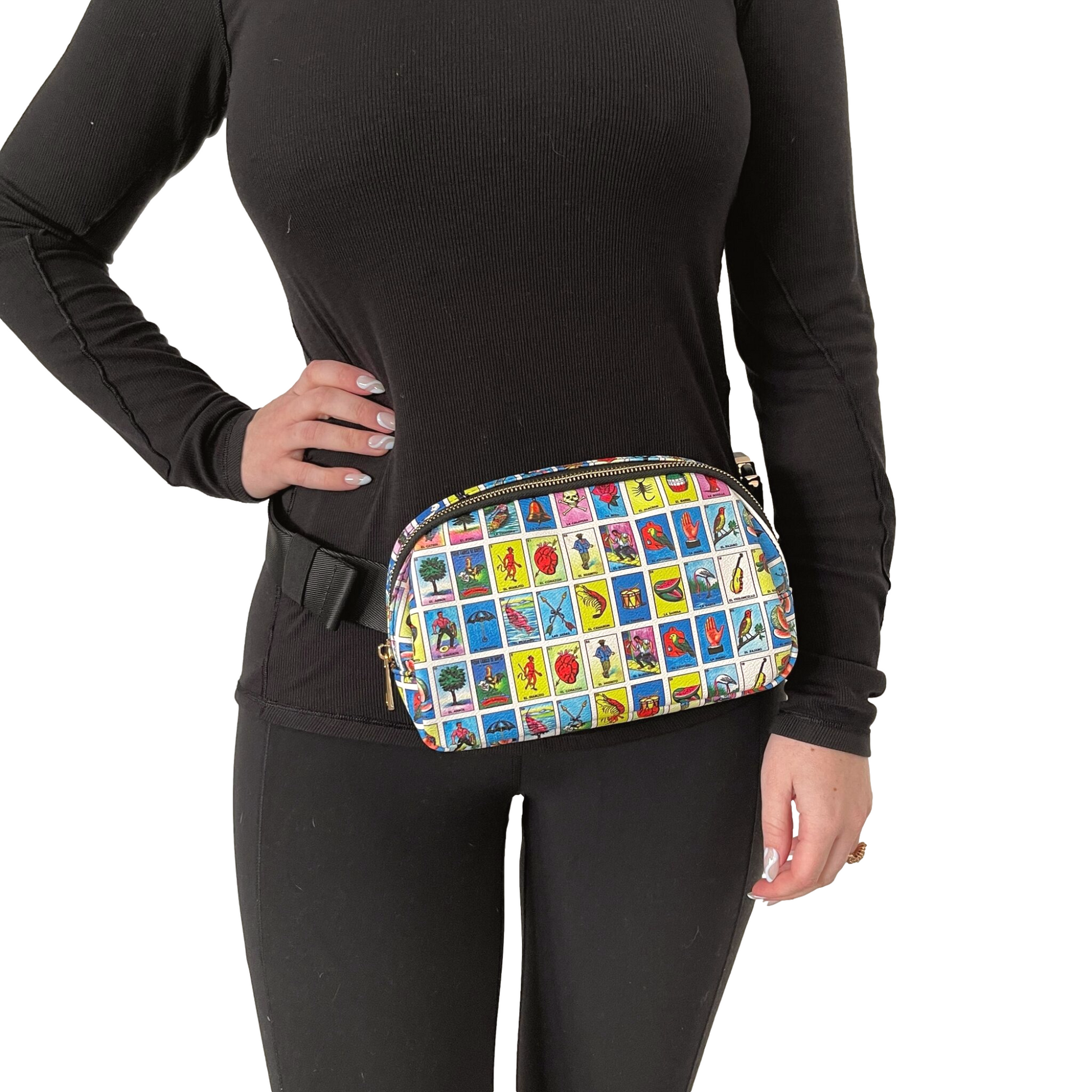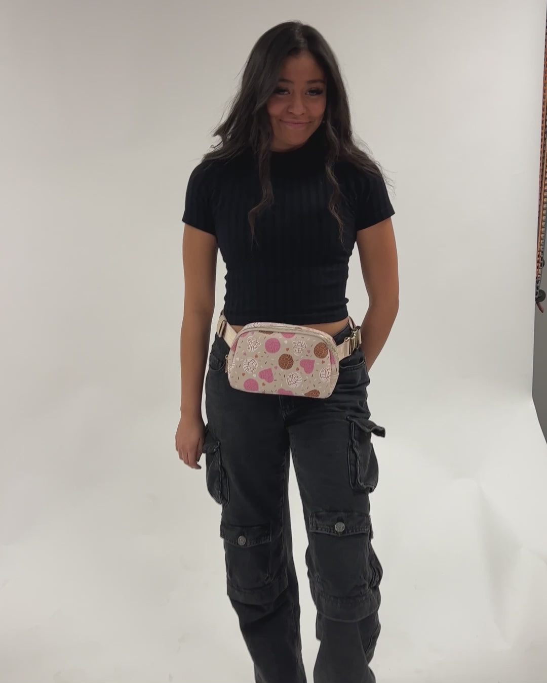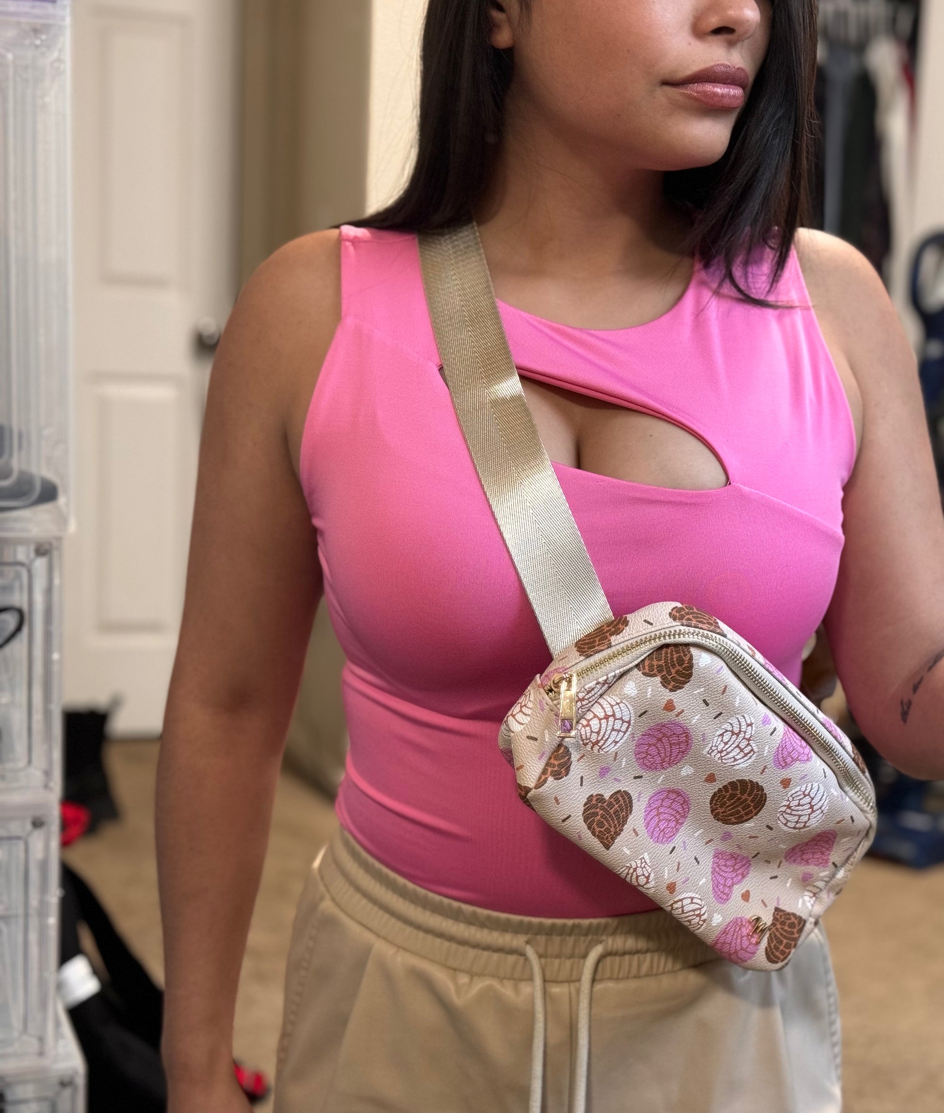 - Once you find your perfect fit, tuck the excess belt bag strap into the elastic loops