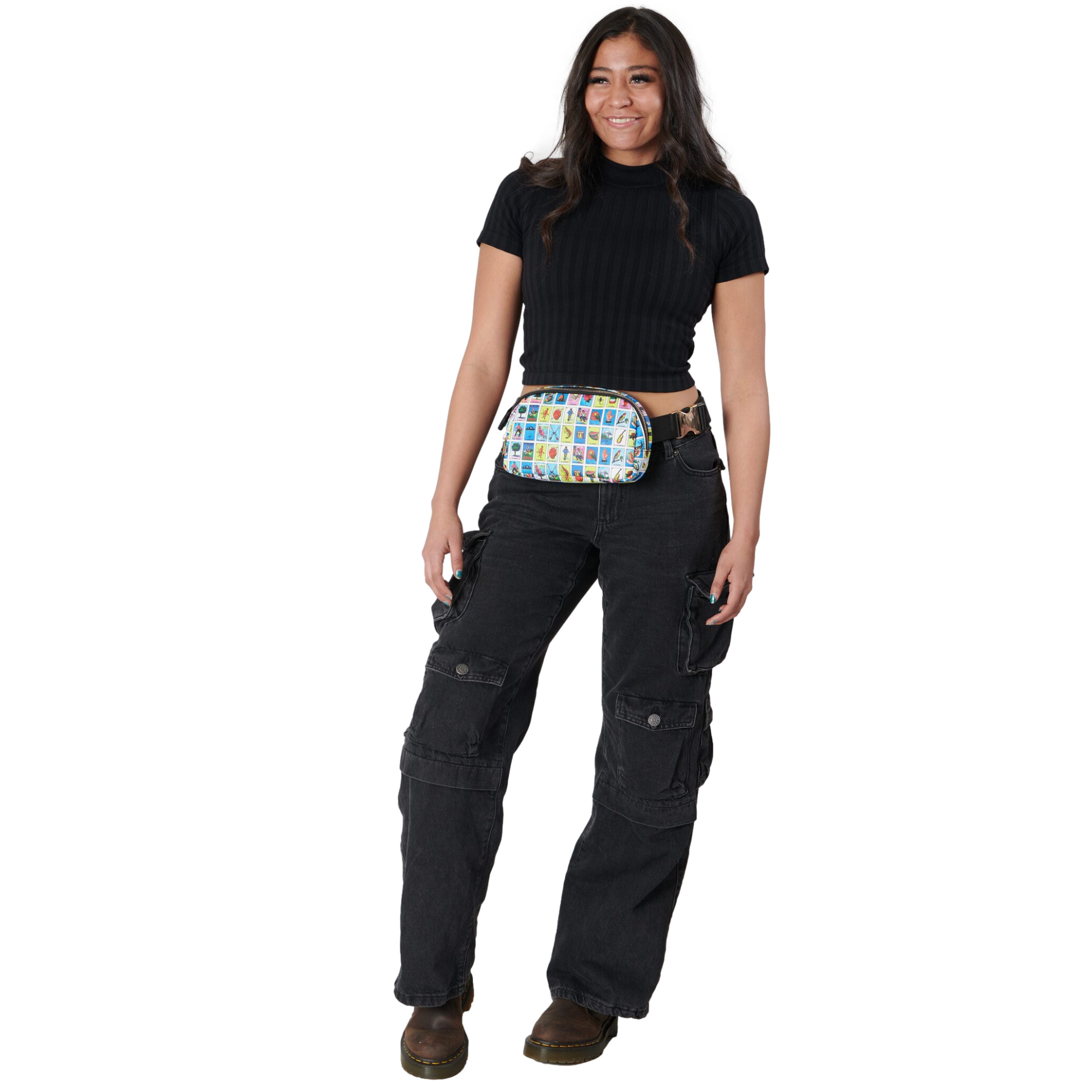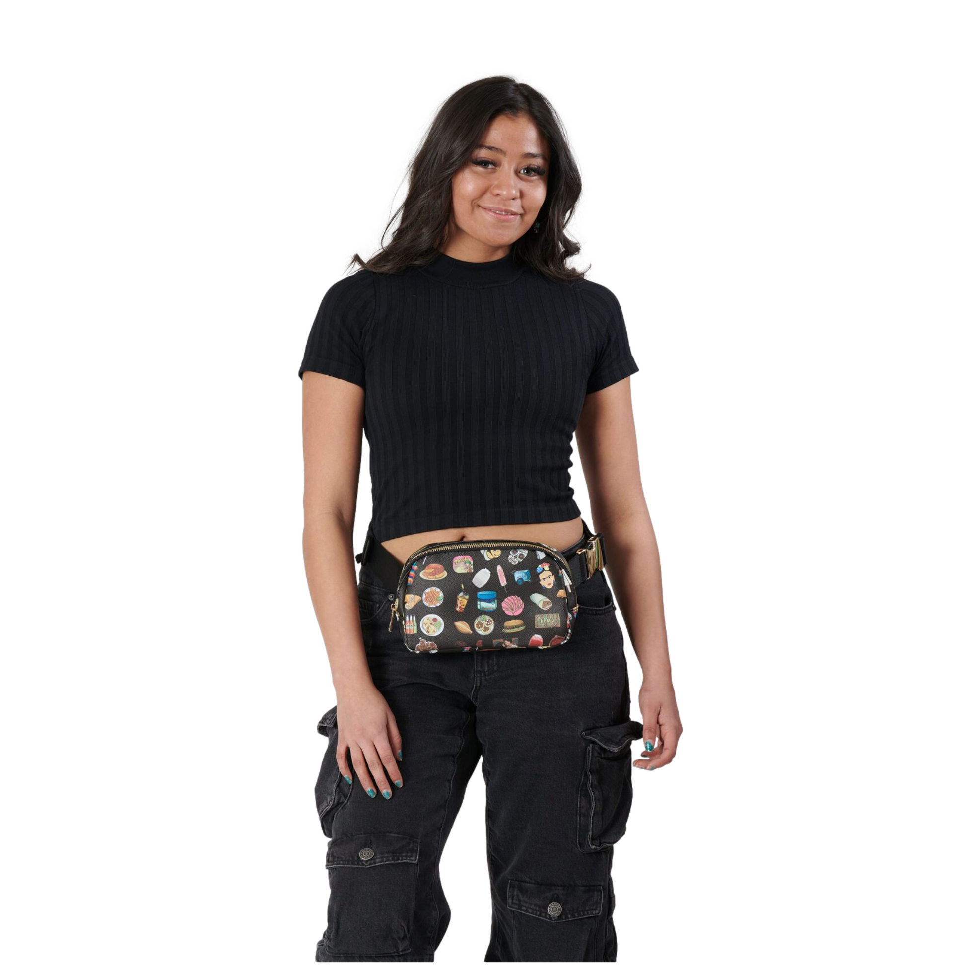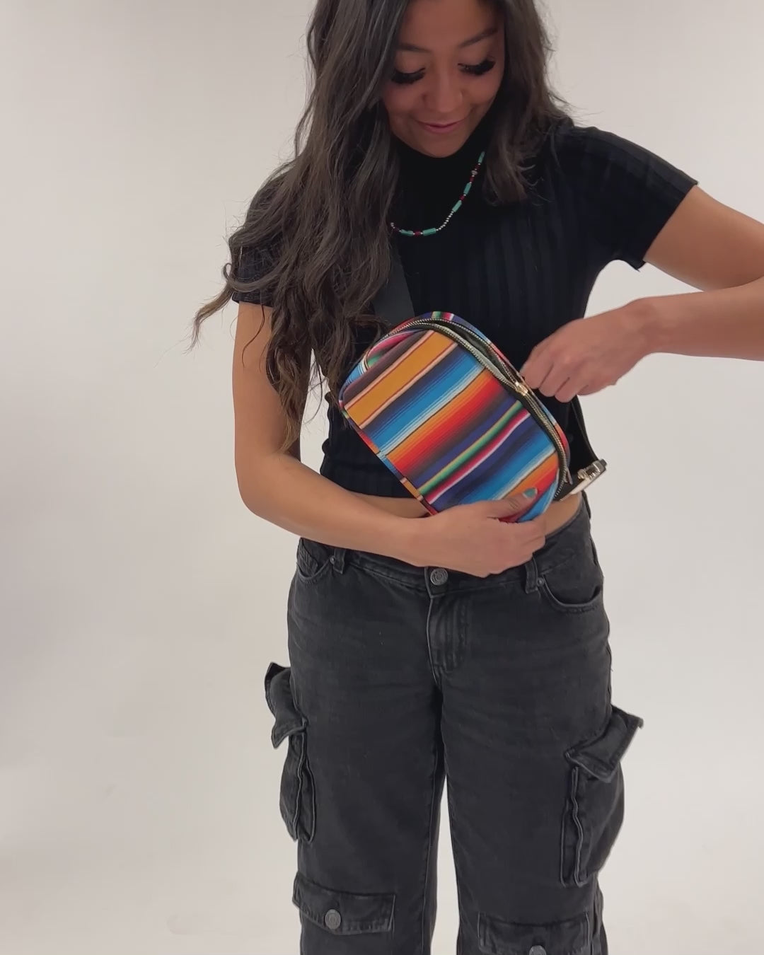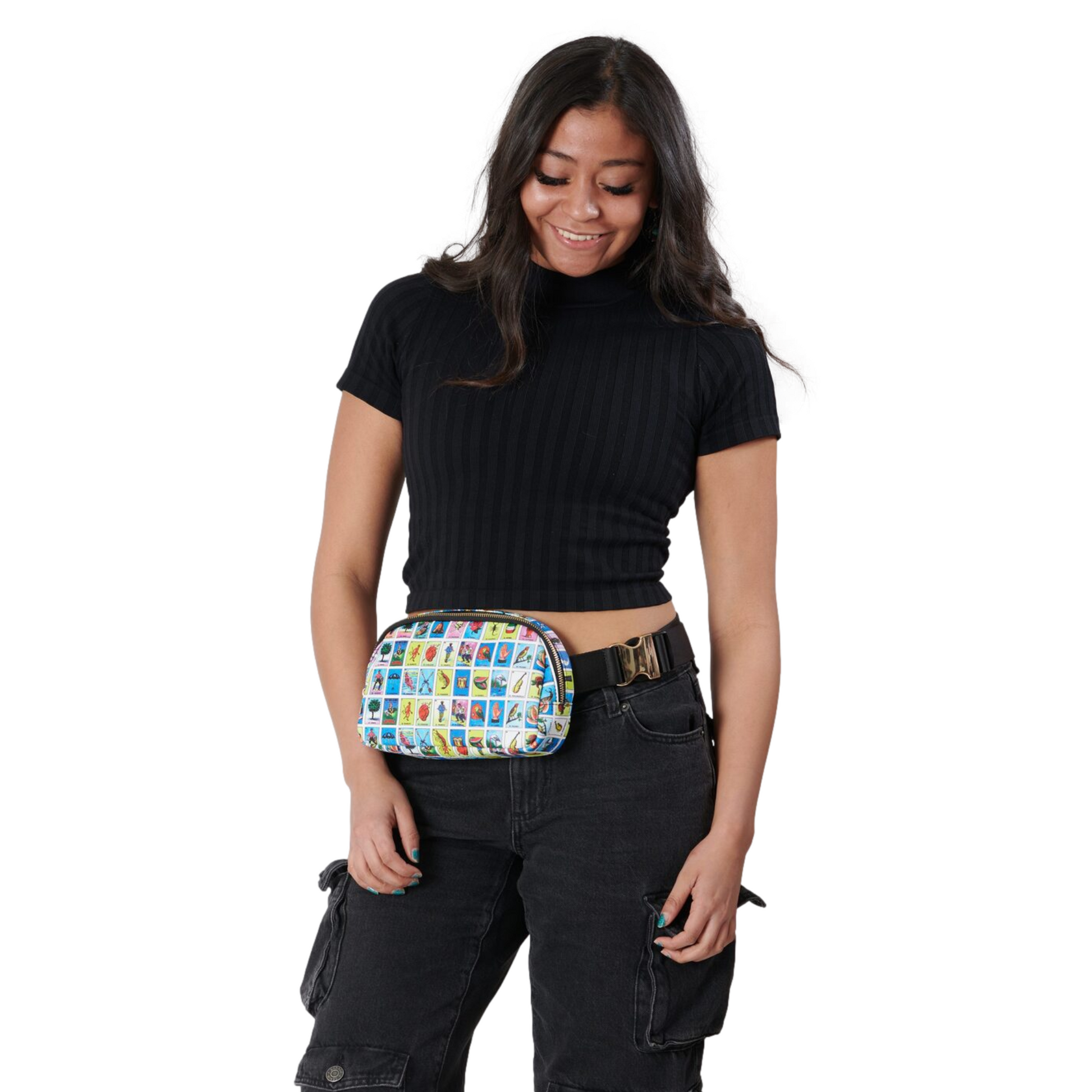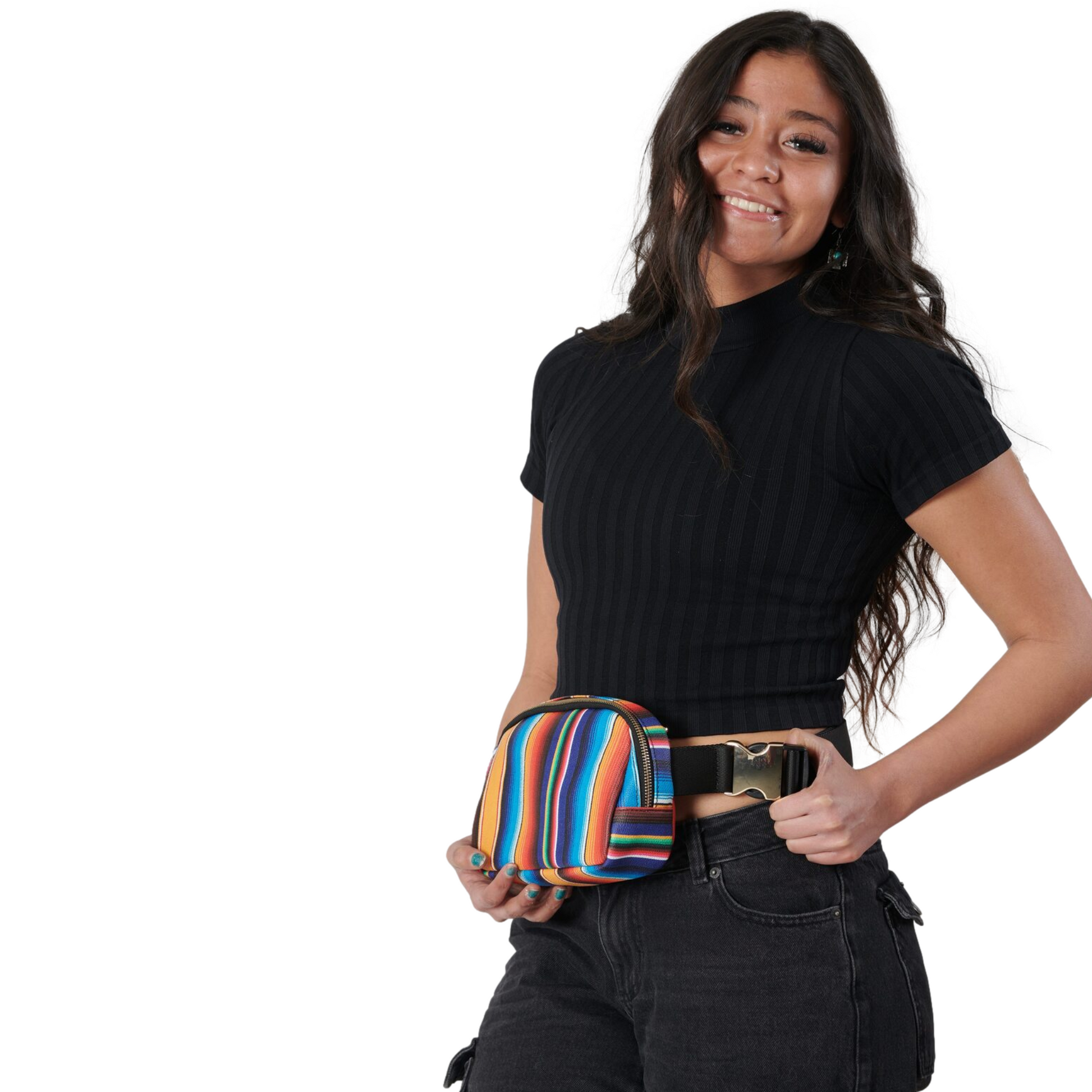 - Once you find your perfect fit, tuck the excess belt bag strap into the elastic loops