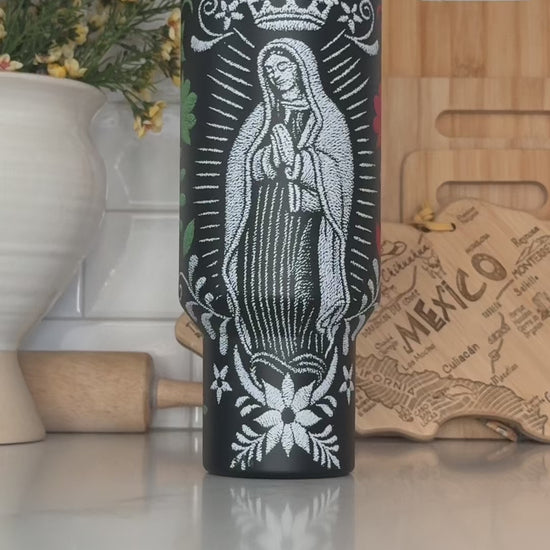 Celebrate faith, culture, and heritage with the Queen of Mexico Special Edition Tumbler. This 40oz stainless steel tumbler showcases a breathtaking embroidered-style design of Our Lady of Guadalupe, crowned and radiant, surrounded by intricate floral patterns in the bold colors of the Mexican flag.